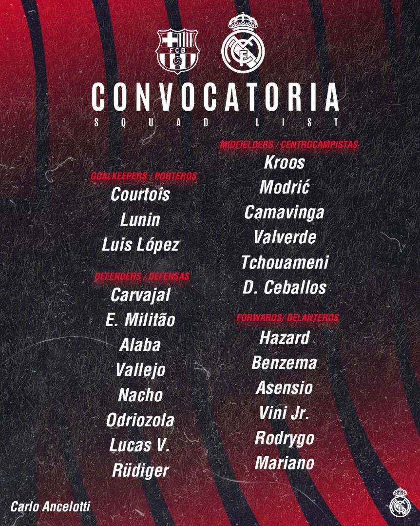 აღსანიშნავია, რომ "სამეფო გუნდს" მხოლოდ ფერლან მენდი დააკლდება, რომელიც მატჩს ტრავის გამო გამოტოვოებს.