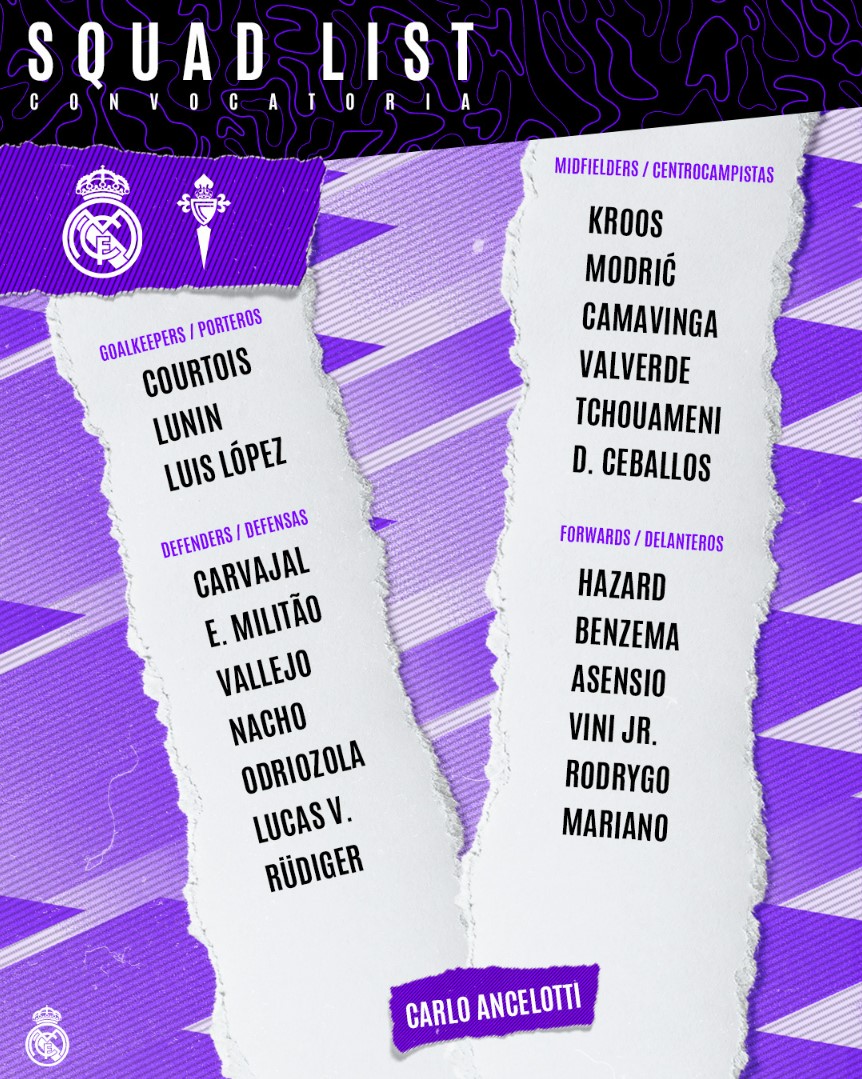 დანაკლისთან დაკავშირებით, "სამეფო გუნდს" ვიგოელებთან მატჩში ტრავმების გამო დავიდ ალაბა და ფერლან მენდი ვერ დაეხმარებიან.