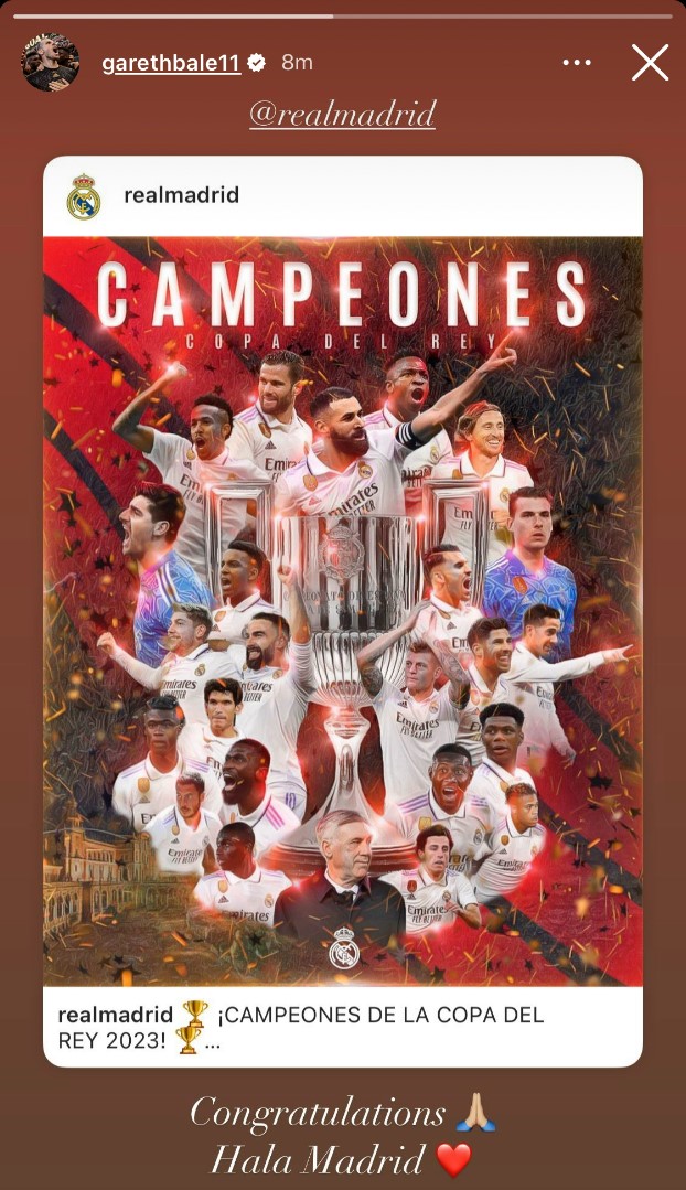 მადრიდელებს ეს წარმატება "სამეფო გუნდის" ყოფილმა ფეხბურთელმა, გარეტ ბეილმაც მიულოცა, რომელმაც სოციალურ ქსელში პოსტი განათავსა.
